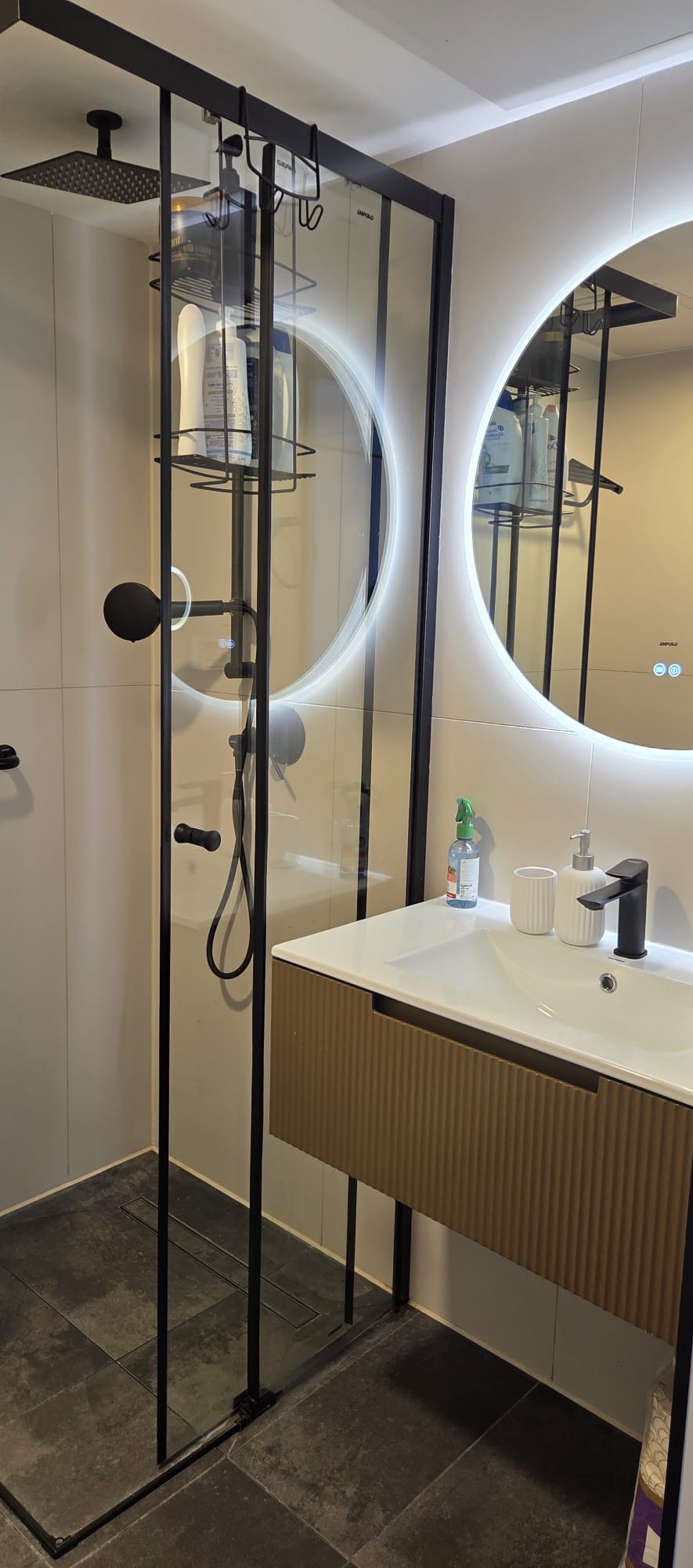 חדר רחצה מעוצב: מראה חכמה עם תאורה והפשרת אדים, מקלחת, שירותים ובידה (דוד חשמלי).